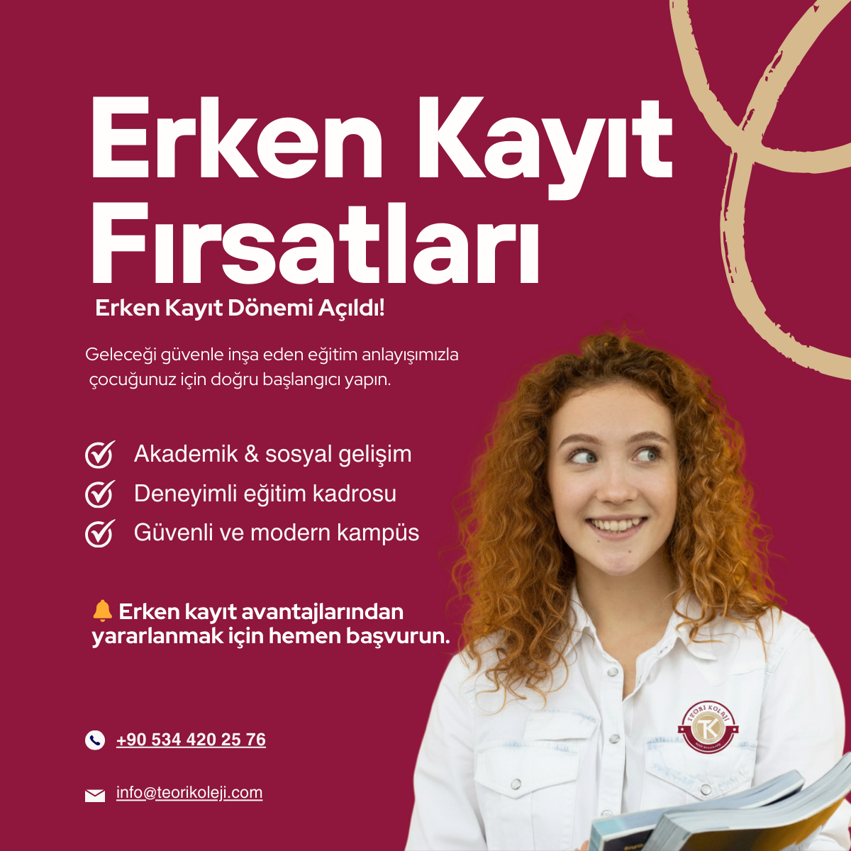 Teori Koleji, "Bilgi Gelecektir" anlayışıyla eğitimde yenilikçi bir vizyon sunar. Akademik başarıyı, etik değerleri ve yaşam becerilerini harmanlayan kurumumuz, geleceğin bireylerini yetiştirmek için yola çıkmıştır. Eğitim geleneğini gelecekle buluşturarak öğrencilerimize ve tüm paydaşlarımıza akademik ve yaşamsal anlamda değer katmayı amaçlıyoruz.